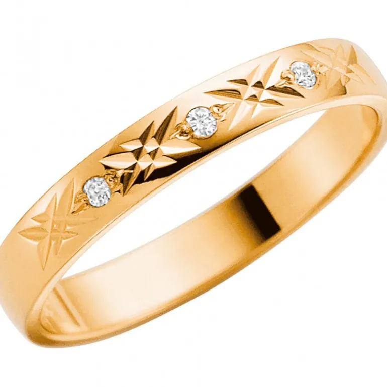 Förlovningsring eller vigselring från Schalins ringar. Ring med kryssmönster och tre små diamanter.