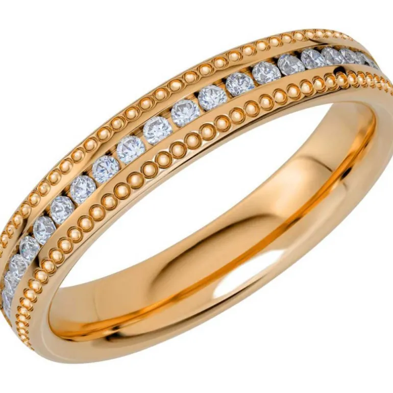 Reflection 06, mönstrad alliansring med små kulor som mönster på sidorna. Diamantring med 22 små briljantslipade diamanter. Tillverkad i äkta guld 14 karat av Schalins ringar i Östersund.