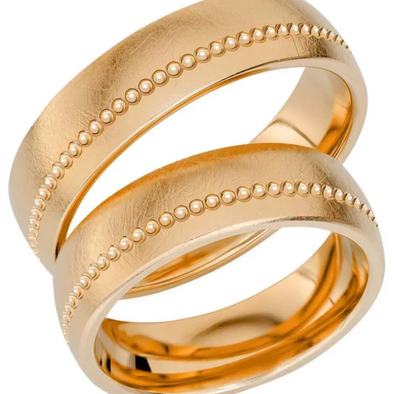 Reflection 07, bred matterad förlovningsring och vigselring med mönster som kulor runt hela ringen och matterad yta. Guldring i äkta guld 14 karat tillverkad av Schalins ringar.