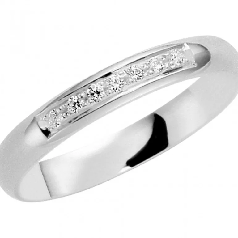 Ring med sju små diamanter från Schalins ringar. Fin som vigselring med kupad utsida och lätt kupning på insidan. Passar bra till den släta ringen som heter 81-3. Andra ringar med samma ringskena är 203-34,3 och 213-31,5.