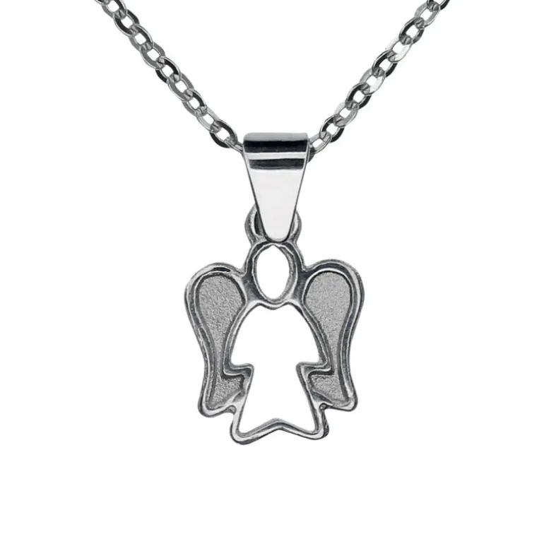 Halsband med smycke ängel, öppen i mitten med ängeln i kontur och vingarna matterade med blanka kanter.