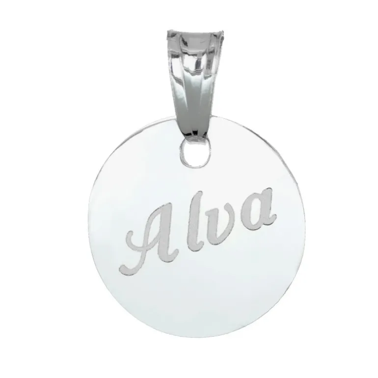 Smycke rund berlock med valfri gravyr. Äkta silver 925. Diameter på smycket 15 mm. Skriv önskad text vid beställningen. Typsnitt och uppställning blir som på bild.