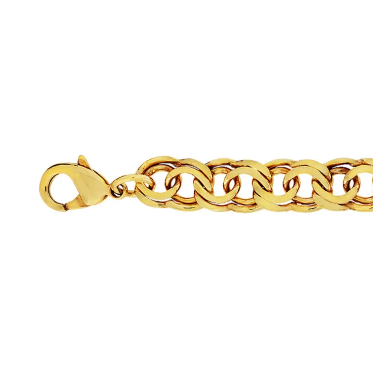 Bismarckarmband i guldförgylld mässing, bred länk klassisk bismarck med dubbla öglor vridna åt olika håll. Bredd 10,8 mm.