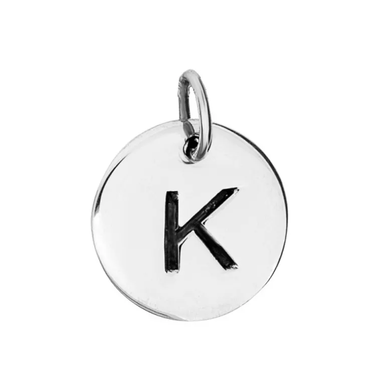 Bokstavsberlock, smycke med bokstav K djupt graverad. Gravyren är oxiderad, dvs bokstaven syns bra då den är lite svartgrå i färgen. Ytterdiameter 12 mm. Material äkta silver 925.