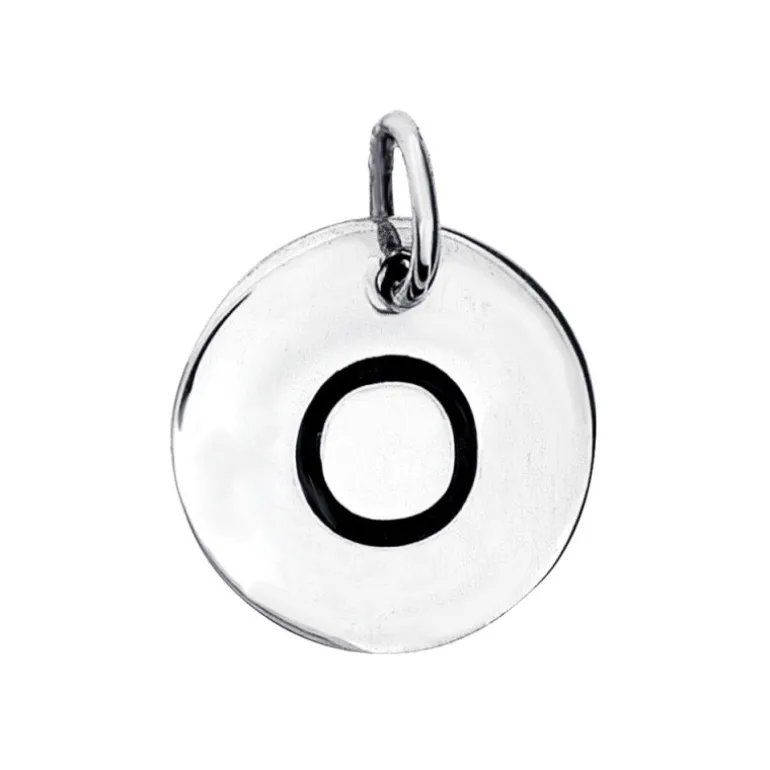 Bokstavsberlock, smycke med bokstav O djupt graverad. Gravyren är oxiderad, dvs bokstaven syns bra då den är lite svartgrå i färgen. Ytterdiameter 12 mm. Material äkta silver 925.