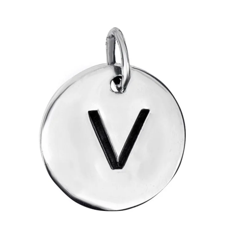 Bokstavsberlock, smycke med bokstav V djupt graverad. Gravyren är oxiderad, dvs bokstaven syns bra då den är lite svartgrå i färgen. Ytterdiameter 12 mm. Material äkta silver 925.
