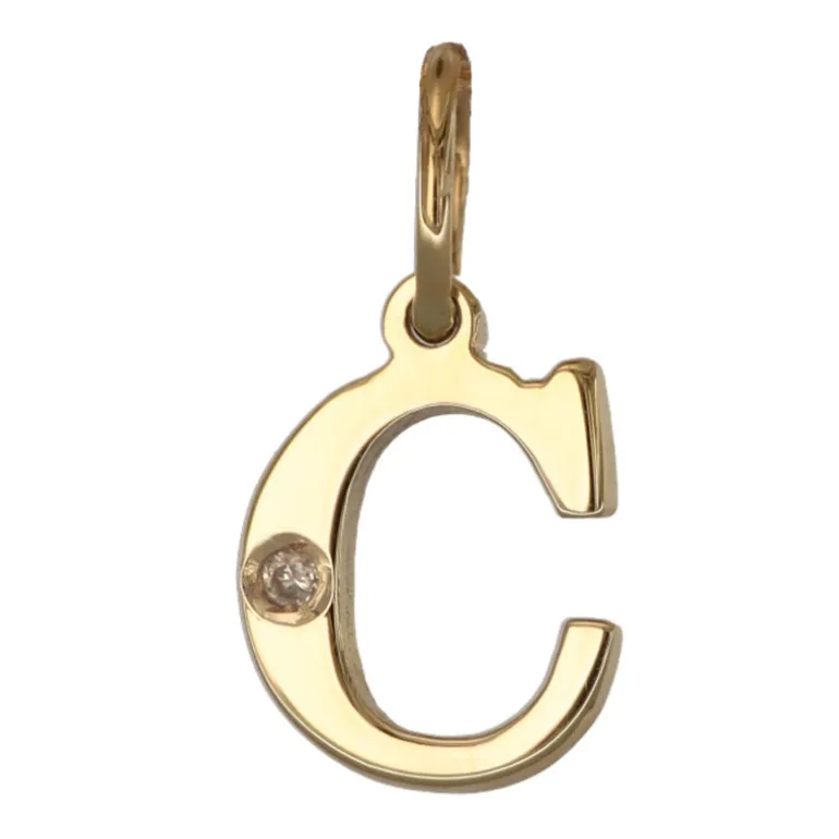 Bokstavssmycke i äkta guld 9 karat, bokstav C med liten diamant 0,005 carat. Höjd på bokstaven 8 mm, höjd inklusive ögla 11,5 mm, tjocklek 1,3 mm. Smycke med bokstav tillverkad i 9 karat guld, en legering bestående av 37,5 % guld och resten silver och koppar.