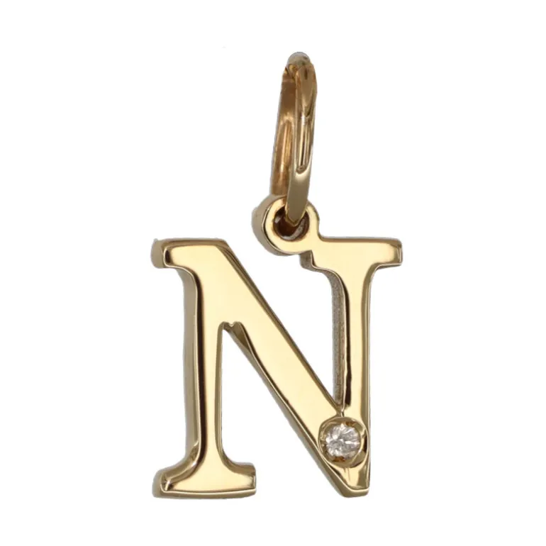 Bokstavssmycke i äkta guld 9 karat, bokstav N med liten diamant 0,005 carat. Höjd på bokstaven 8 mm, höjd inklusive ögla 11,5 mm, tjocklek 1,3 mm. Smycke med bokstav tillverkad i 9 karat guld, en legering bestående av 37,5 % guld och resten silver och koppar.