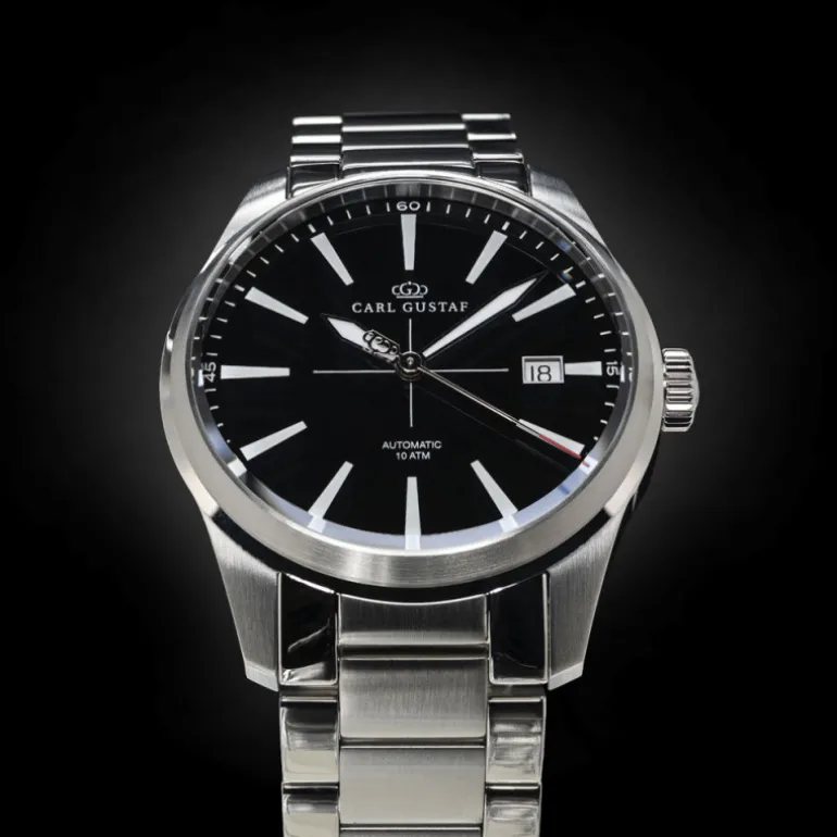 Klocka från Carl Gustaf, automatklocka med snygg länk och boett i rostfritt stål. Svart urtavla.