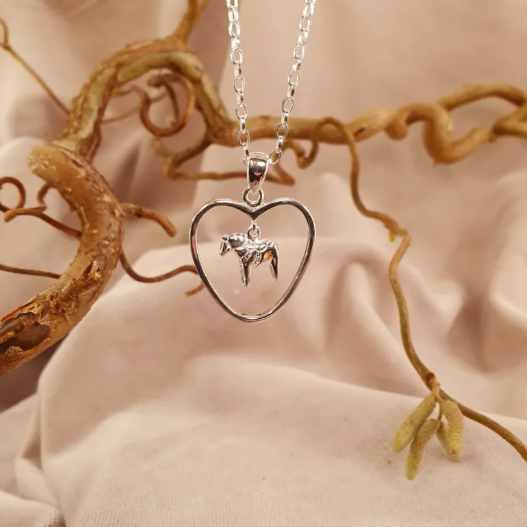Halsbandmed hjärta i kontur och kurbitsmönstrad dalahäst i äkta silver.
