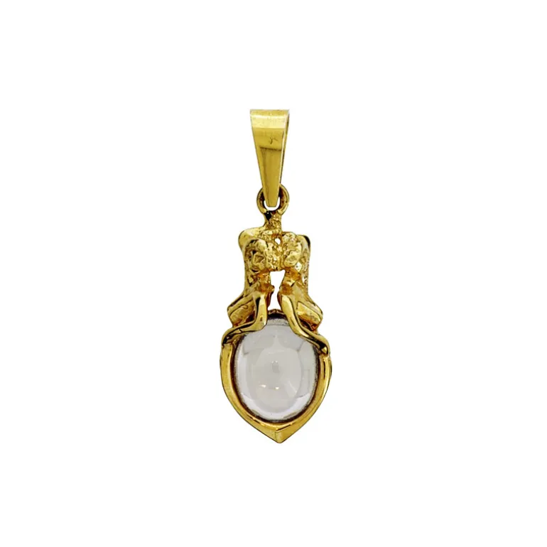 Emmahänge från Zorn Jewellery i äkta guld 18 karat med kvinnokroppar sett från sidorna på smycket och i mitten en vit nästan genomskinlig sten 7*9mm ,höjd på smycket inklusive ögla 30mm.