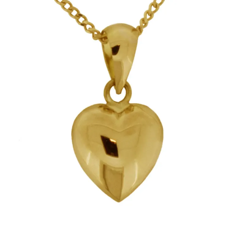 Guldhalsband med klassiskt slätt bulligt guldhjärta, guldkedja modell pansar i kort längd som passar till barn.