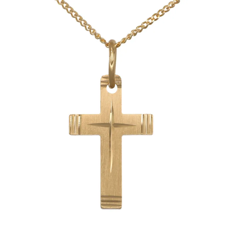 Guldhalsband med matterat och mönstrat guldkors och guldkedja modell pansar, äkta guld 18 karat. Snyggt stilrent graverat mönster.