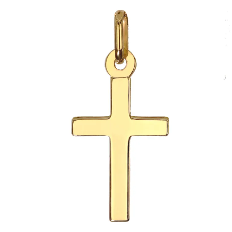 Guldkors, slätt kors smycke i äkta guld 9 karat. Höjd inklusive ögla 25 mm, bredd 11,8 mm och tjocklek 1,2 mm. 9 karat är en legering bestående av 37,5 % guld och resten silver och koppar. Ett bra alternativ om man vill ha ett smycke i äkta guld till lägre pris.