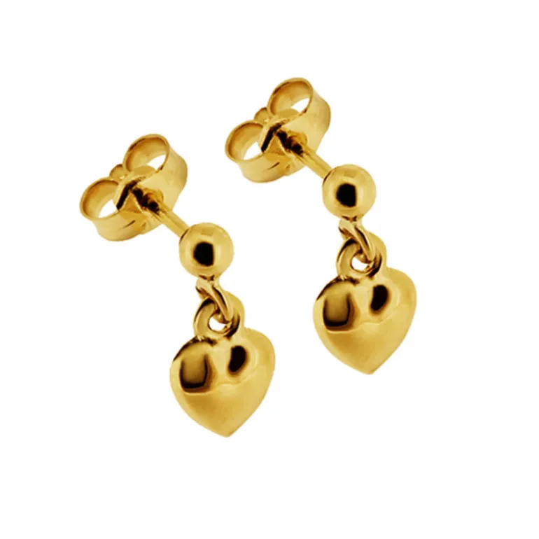 Guldörhängen med hängande hjärtan. Örhänge med slät klassiskt bulligt hjärta.