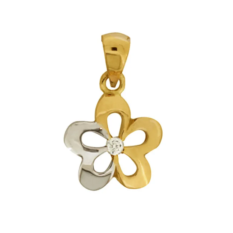 Smycke med blomma i äkta guld 18 karat, liten del av framsidan i vitt guld och gnistrande sten i mitten.