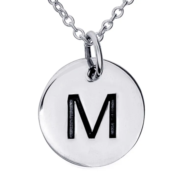 Halsband med rund berlock bokstaven M graverad, kedja ingår. Äkta silver 925.