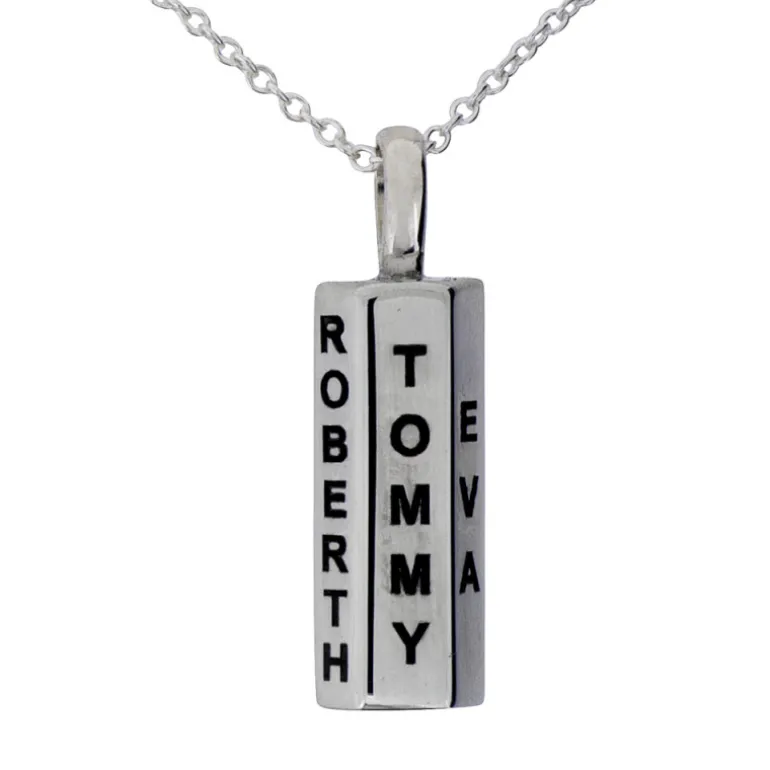 Halsband i form som en silvertacka med tre sidor som går bra att gravera. Kedja ingår. Äkta silver 925.