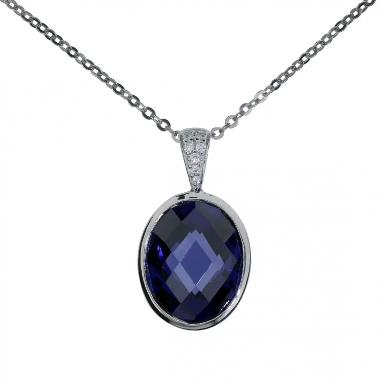 Snyggt halsband med blå fazettslipad tanzanit infattad i äkta silver. På öglan sitter vita gnistrande kubik zirkoner.