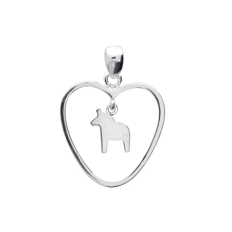 Silverhjärta i kontur som smycke med slät dalahäst i äkta silver.