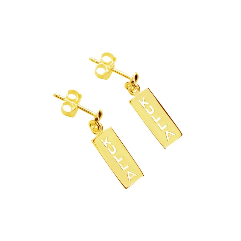 Hängande örhängen i guld 18 karat med texten KULLA utsågat.