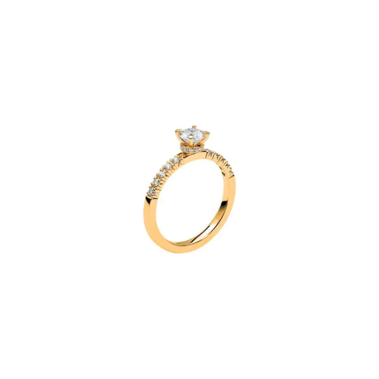 Alliansring med diamanter, mittsten infattad i fattning med fyra klor dekorerad med diamanter runt om och sidostenar, Love 14 från Schalins ringar.