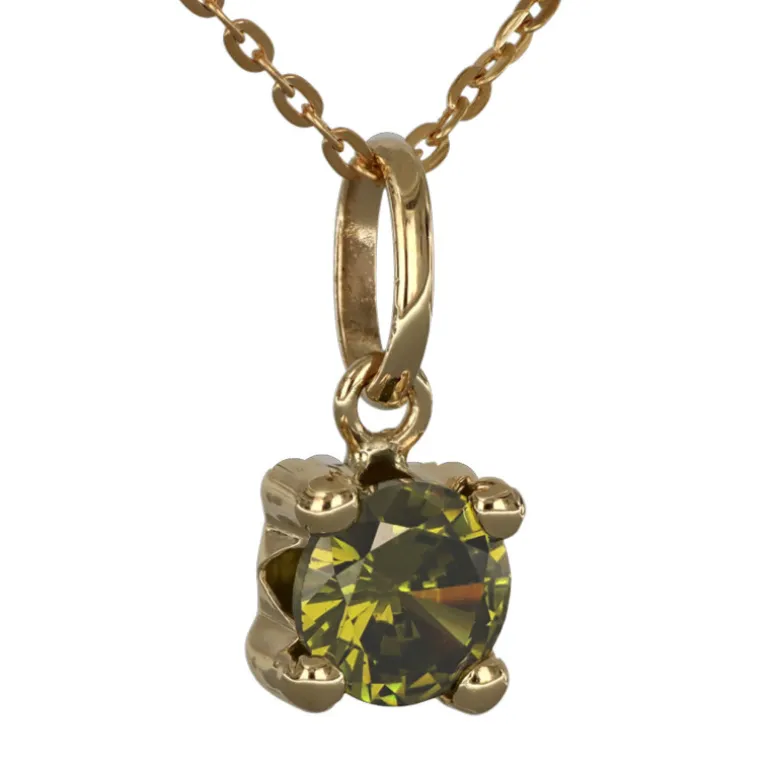 Halsband med månadssten smycke för månad augusti i äkta guld 9 karat. Storlek på stenen 5 mm i diameter, höjd på smycket inklusive ögla 11 mm. Färgad syntetisk ljusgrön sten liknande peridot. Kedja modell ankar, bredd 0,6 mm artikel 9-50-0001. Material äkta guld 9 karat, det vill säga en blandning, legering, av 37,5% guld och resten silver och koppar.