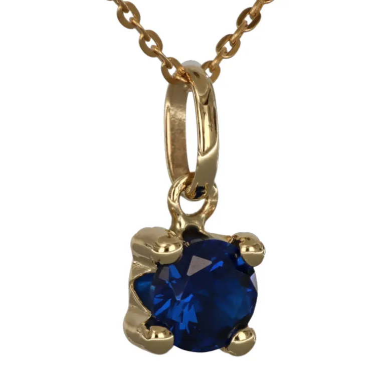 Halsband med månadssten smycke för månad september i äkta guld 9 karat. Storlek på stenen 5 mm i diameter, höjd på smycket inklusive ögla 11 mm. Färgad syntetisk blå sten liknande safir. Kedja modell ankar, bredd 0,6 mm artikel 950-0001. Material äkta guld 9 karat, det vill säga en blandning, legering, av 37,5% guld och resten silver och koppar.