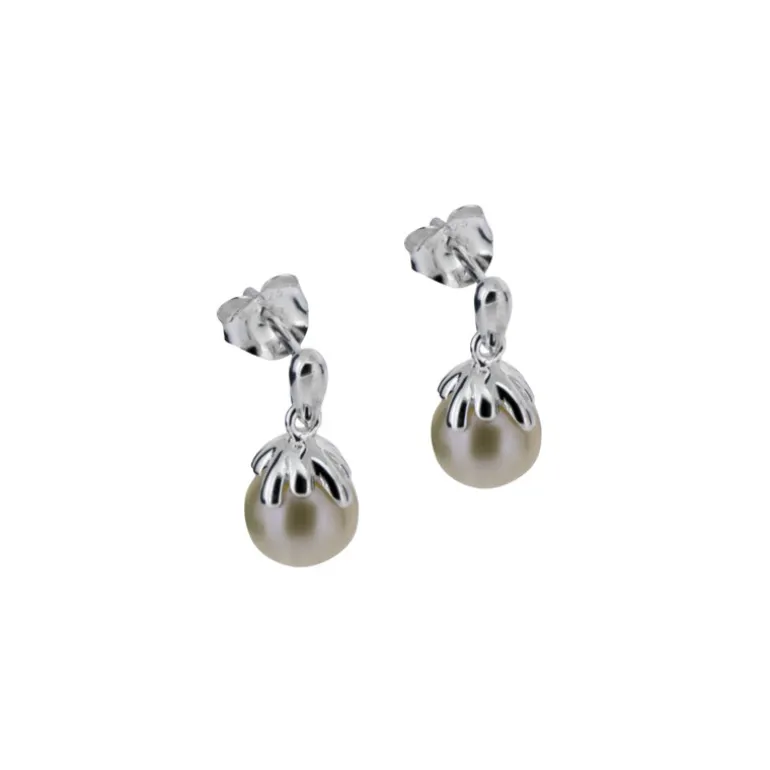 Hängande silverörhängen med vita sötvattenspärlor infattade i snygg silverfattning.