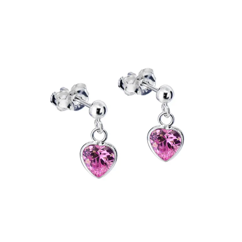 Hängande silverörhängen med rosa gnistrande hjärtan.