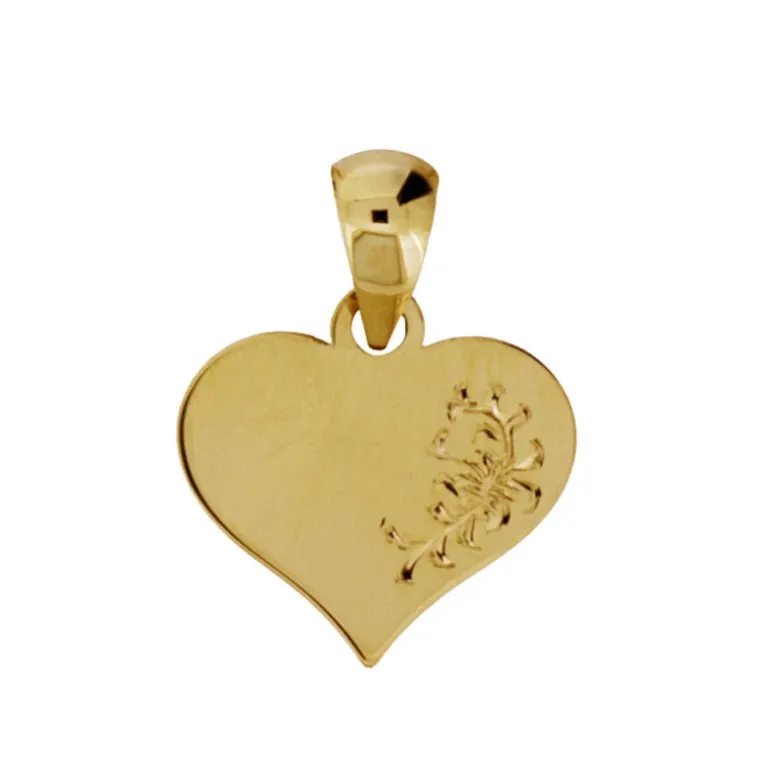 Platt guldhjärta smycke, hjärta i äkta guld 18 karat med blomgravyr på ena sidan.