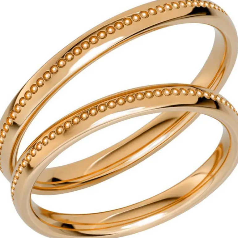 Reflection 09, smal snyggt mönstrad förlovningsring och vigselring med kulor som mönster runt hela ringen. Tillverkad av Schalins ringar i äkta guld 18 karat.