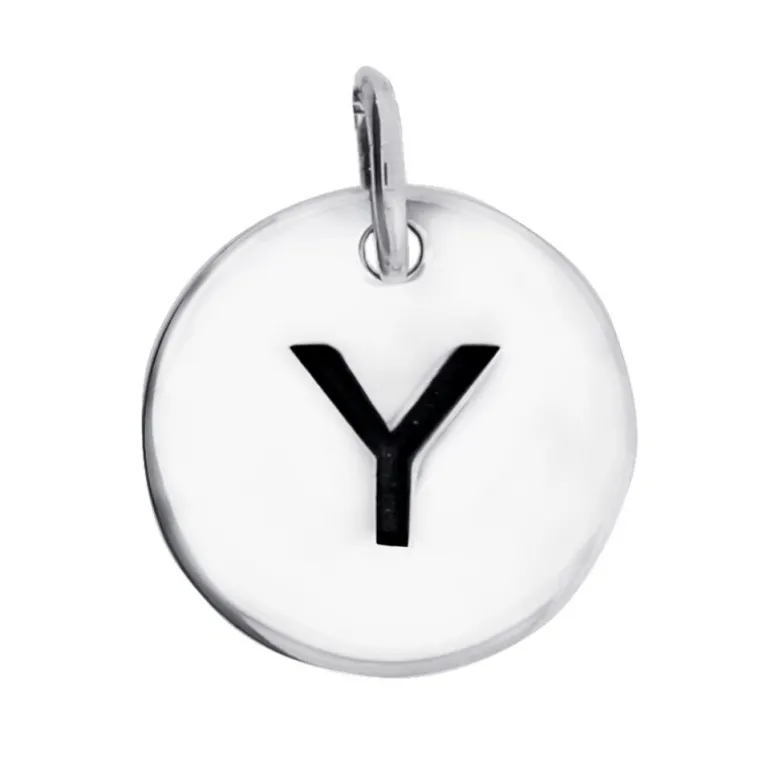 Rund berlock, smycke med bokstav Y graverad och mörk oxiderad text. Material äkta silver.