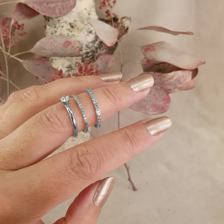 Klassisk alliansring i smal och nätt modell med labbdiamanter fattade i klofattning.