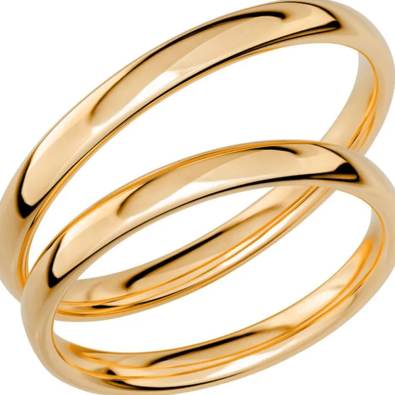 Smal och tunn slät kupad förlovningsring och vigselring i vanligt guld, så kallat rödguld, Sign of love SR 1002 från Schalins ringar.