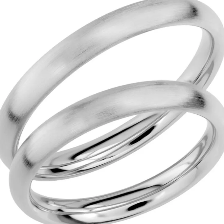 Matterad förlovningsring och vigselring i vitt guld 18 karat, lätt matt yta på kupad rundad vitguldsring. Modellen heter SR1010 och är tillverkad av Schalins ringar. Tänk på att en matt yta är lite känsligare för repor än en vanlig slät ring. Med tiden kommer matteringen att nötas bort, då repor på matta ytor blir blanka. Om man önskar går det i så fall att förbättra den matta ytan igen.