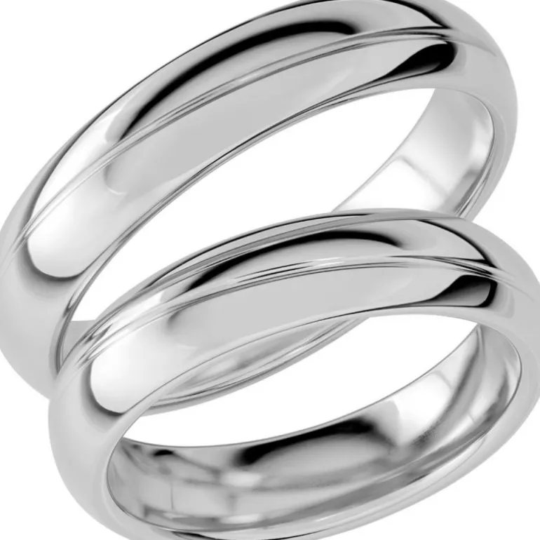 Förlovningsring och vigselring i vitt guld 18 karat, slät med graverat spår snett runt ringen. Sign of love SR1027 tillverkad av Schalins ringar.