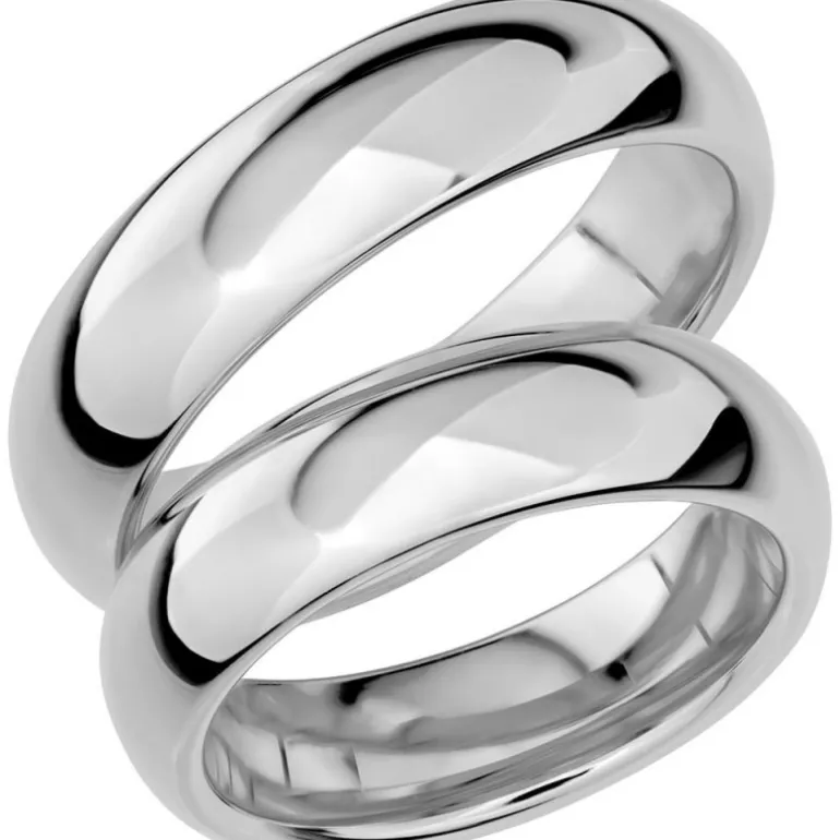 Bred och kraftig slät kupad rundad förlovningsring och vigselring i vitt guld, Sign of love SR1028 tillverkad av Schalins ringar.
