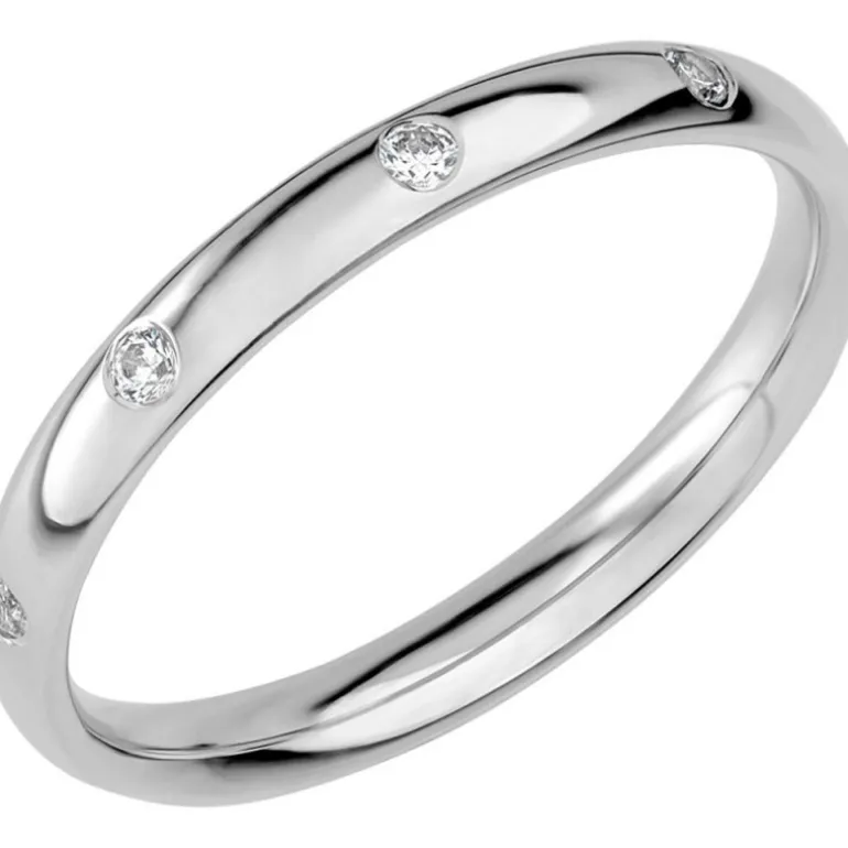 Smal kupad rund platinaring med diamanter utspritt på ringen.