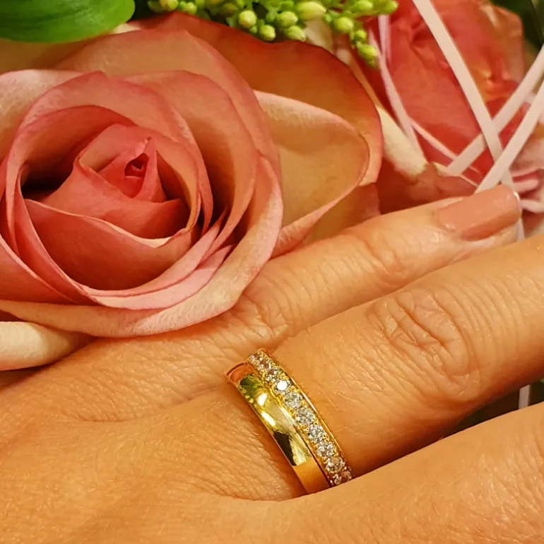 Ringen har en lätt rundad profil och vi kan tillverka den i olika bredder i vanligt rödguld, vitguld eller silver.