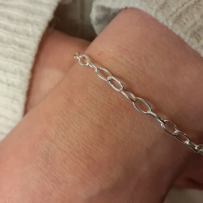 Silverarmband med ovala spetsiga öglor äkta silver 925, längd 18 cm men går enkelt att korta genom att flytta in låset längre in i länken. Bredd 3,9 mm.