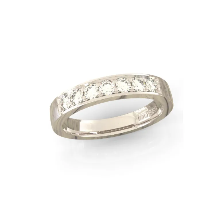 Stilren och snygg vigselring med syntetiska cubik zirkoner fattade i fadenfattning. Stenarna är fattade i en rak rad med små kulor, så kallade tjörn, som håller fast stenarna.