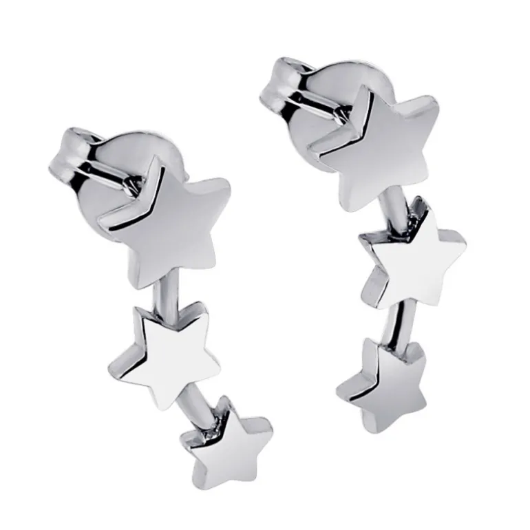 Stjärnfall, örhängen i äkta silver med tre stjärnor på rad som man kan ha hängande neråt eller klättrande uppför örsnibben om man sätter dem lite hårdare som öronklättrare.