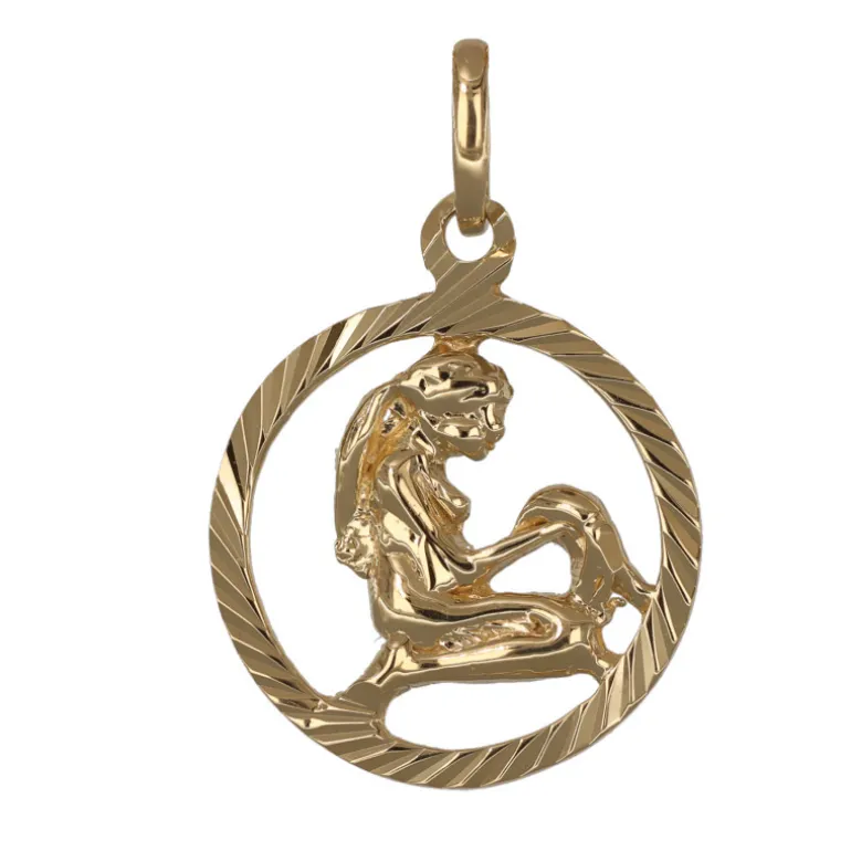 Stjärntecken jungfru, smycke i äkta guld 9 karat. Smycket är tillverkat i 9 karat guld, det vill säga en blandning av 37,5 % guld och resten silver och koppar. Ytterdiameter 14 mm, höjd inklusive ögla 21 mm. Det kan skilja lite inom astrologin, men om du är född mellan 24 augusti och 22 september är du född i jungfruns tecken.