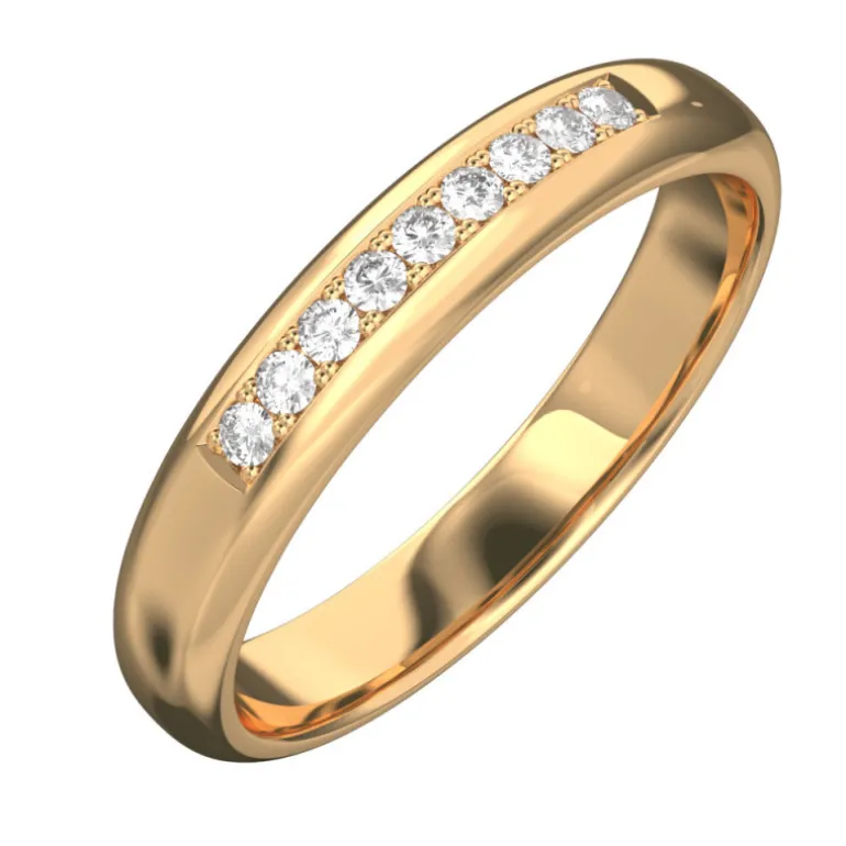 Vikarbyn 0,09 ct – nio diamanter infattade på rad på klassiskt kupad guldring som förlovningsring eller vigselring