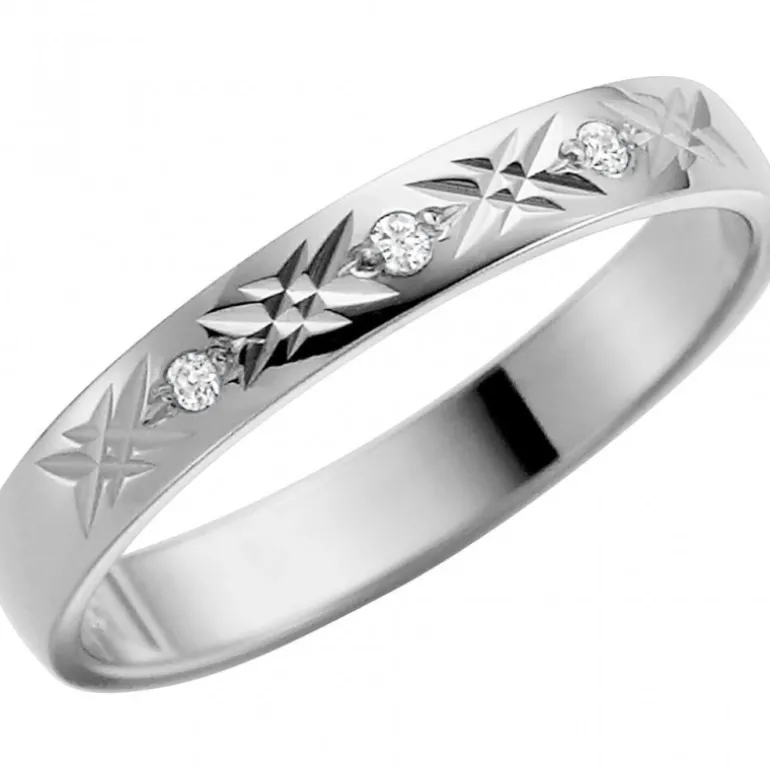 Förlovningsring eller vigselring från Schalins ringar. Ring med kryssmönster och tre små diamanter.