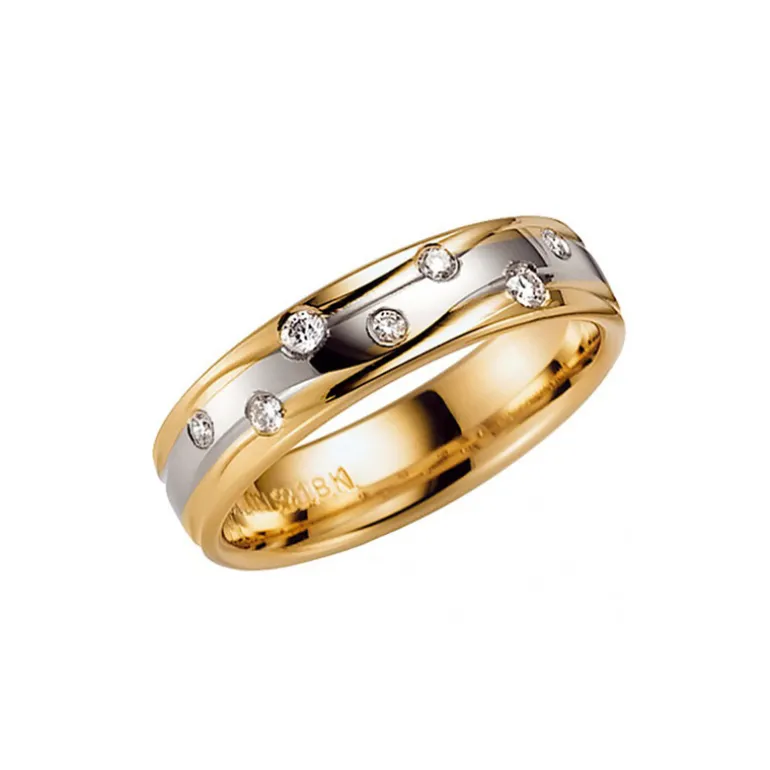 Alliansring, vigselring med diamanter, på en ring med både rödguld och vitguld. Mönster i form av en våg runt hela ringen med strösslade diamanter. Tillverkare Schalins ringar. Kombinera gärna med slät ring art nr 720-5 eller art nr Davos.