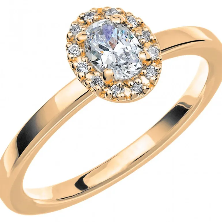 Haloring i 14 karat guld med diamanter total carat 0,39 ct. Oval diamant i mitten med flera små diamanter runt om. Gravyr ingår.