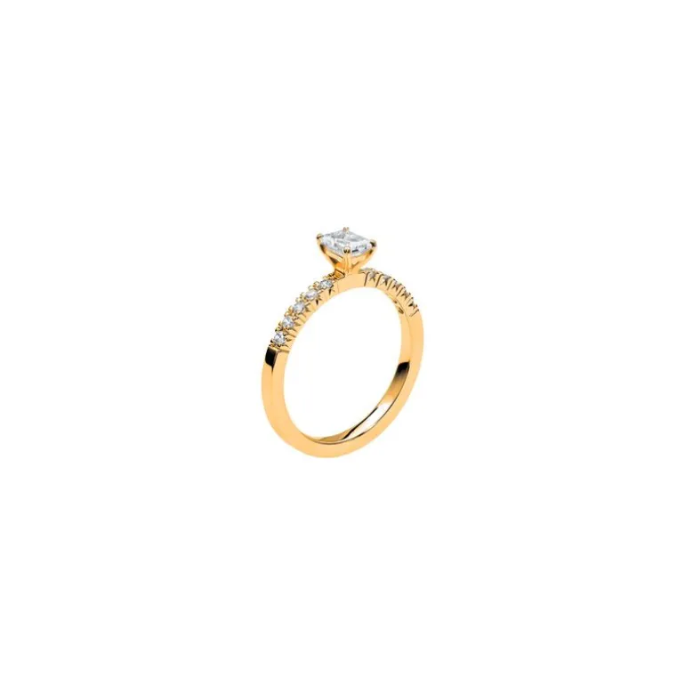 Snygg ring med baguettslipad rektangulär diamant i mitten och briljantslipade sidostenar, Love 12 i 14 karat rödguld från Schalins ringar.