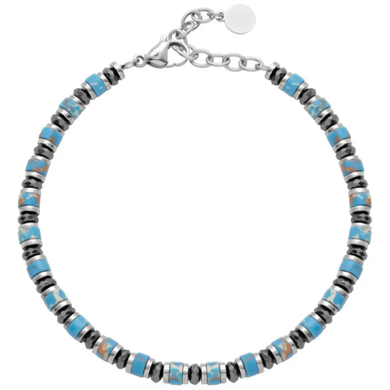Atlas, beadarmband snyggt armband i rostfritt stål med turkos och grå detaljer. Unisex, passar både kille och tjej. Justerbart i längd 18-21 cm.